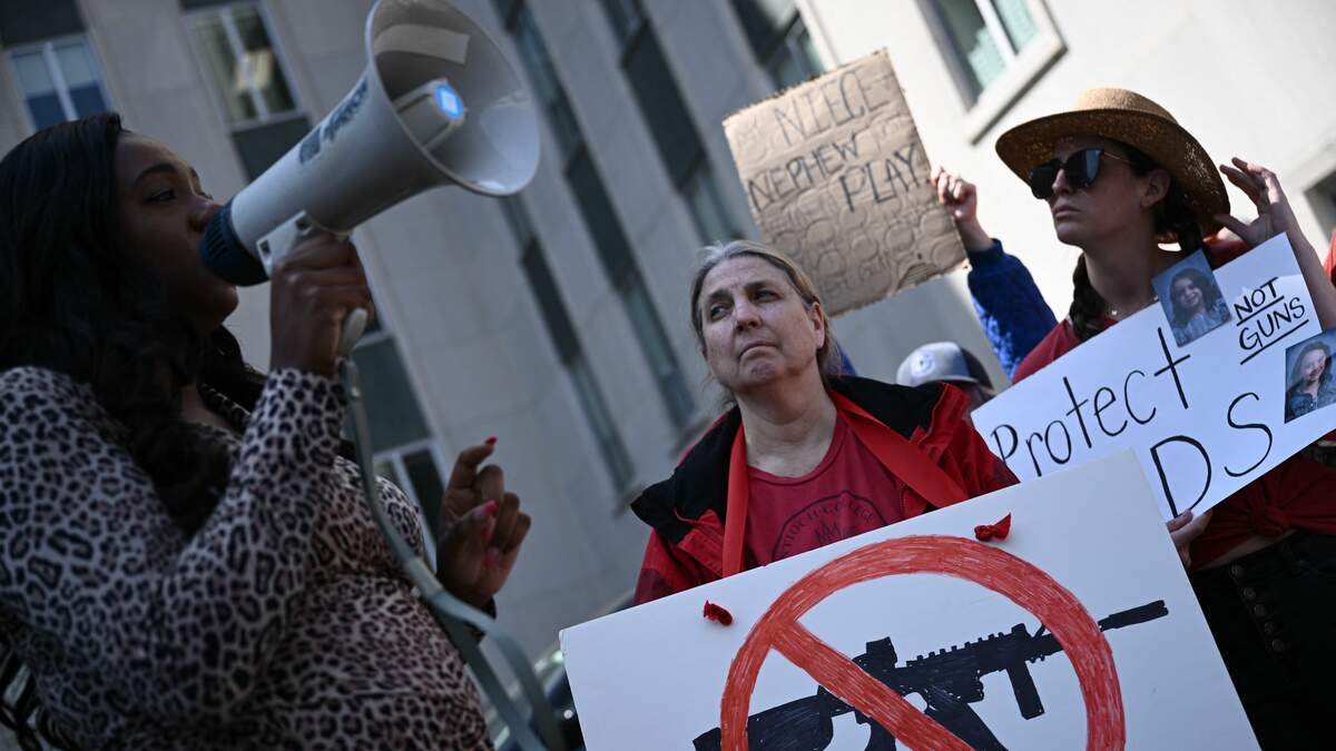 Gun control activists rally in Nashville, Tennessee on March 28, 2023, following a school shooting, where three students and three staff members were killed on March 27. - A heavily armed former student killed three young children and three staff in what appeared to be a carefully planned attack at a private elementary school in Nashville on March 27, before being shot dead by police. Chief of Police John Drake named the suspect as Audrey Hale, 28, who the officer later said identified as transgender. (Photo by Brendan SMIALOWSKI / AFP) (Photo by BRENDAN SMIALOWSKI/AFP via Getty Images)