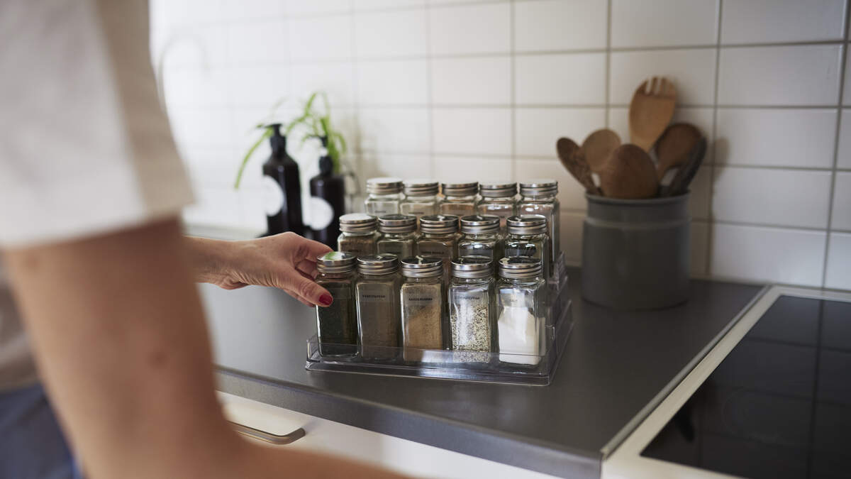 Woman's hands checking spices on spice rack